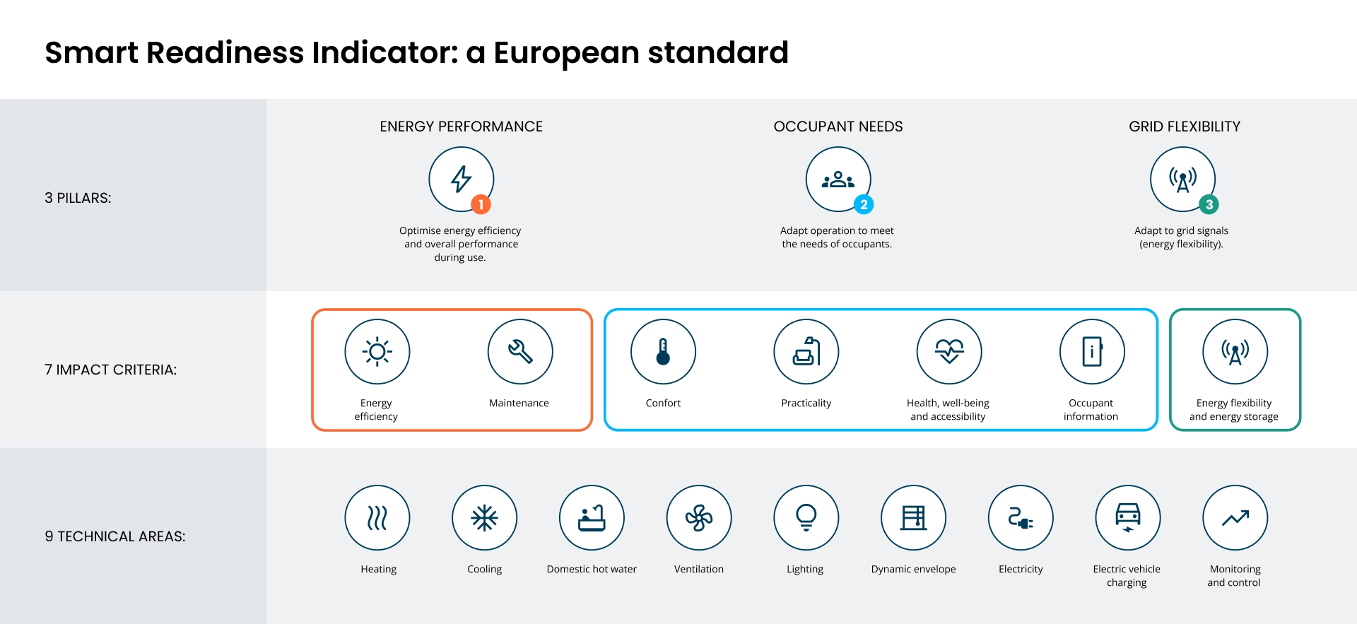 The SRI assesses a building’s ability to integrate smart technologies to fulfil three impact pillars, set out across seven criteria. The analysis covers nine technical domains, including HVAC control, lighting and consumption management, as detailed below:
